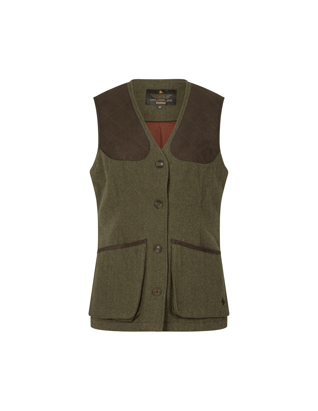 Hillside Harriet Väst blandar elegant traditionell brittisk jaktestetik med modern funktionalitet. Tillverkad av en slitstark ullblandning med 40 % ull och 60 % polyester. Västen är mycket stilig och har quiltade axelklaffar med dekor i mockaimitation. De rymliga framfickorna är tillräckligt stora för dina patroner, och den justerbara midjan ger en skräddarsydd passform. Denna mångsidiga väst är ett komplement till den breda Hillside-kollektionen och finns i storlekar som passar olika kroppsbyggnader. Perfekt för dig som söker klassisk förfining i din skytteklädsel.