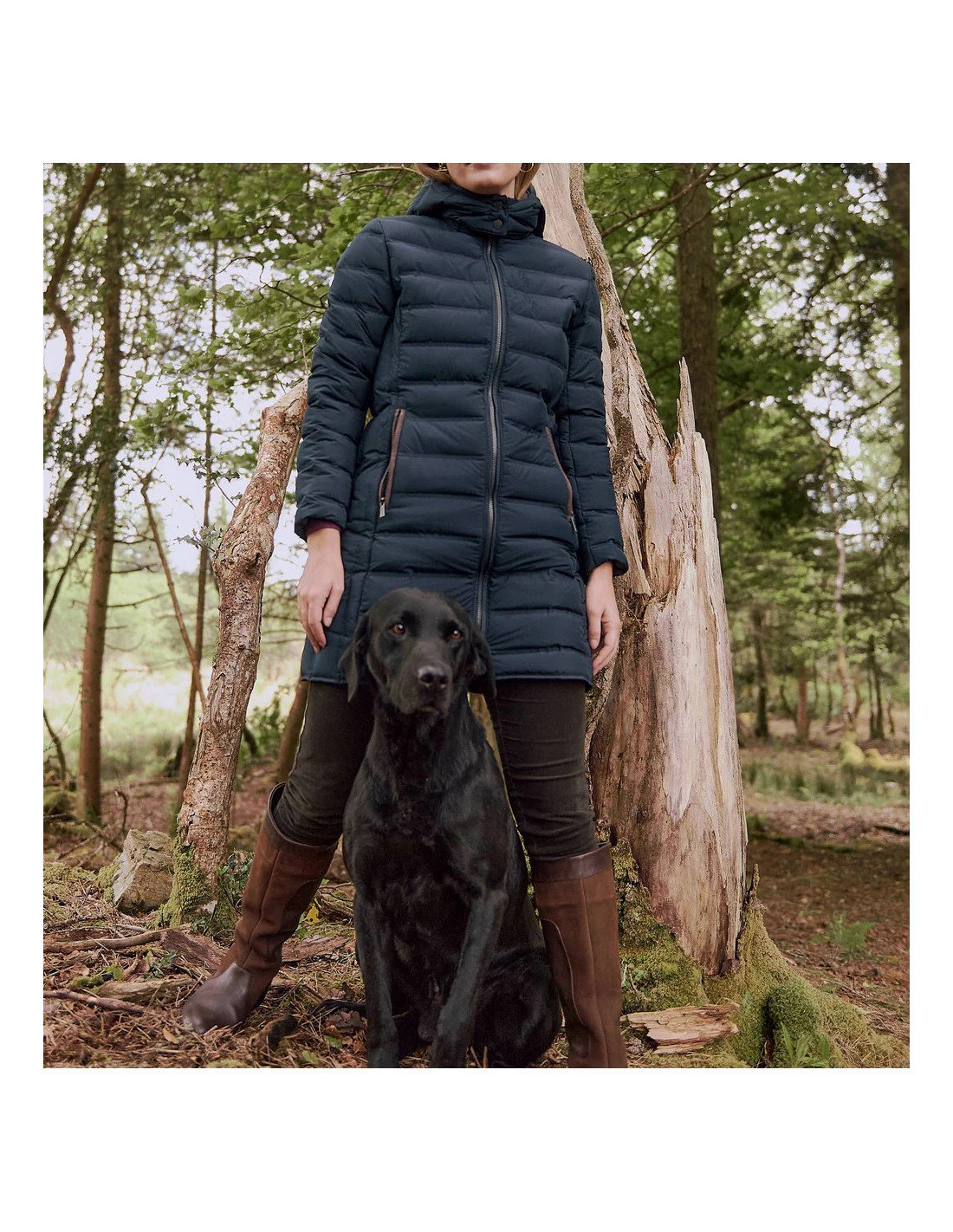 Den är fylld med etiskt hämtad 90% dun och 10% fjädrar. Den har handvärmarfickor, en avtagbar huva och en tvåvägs dragkedja.