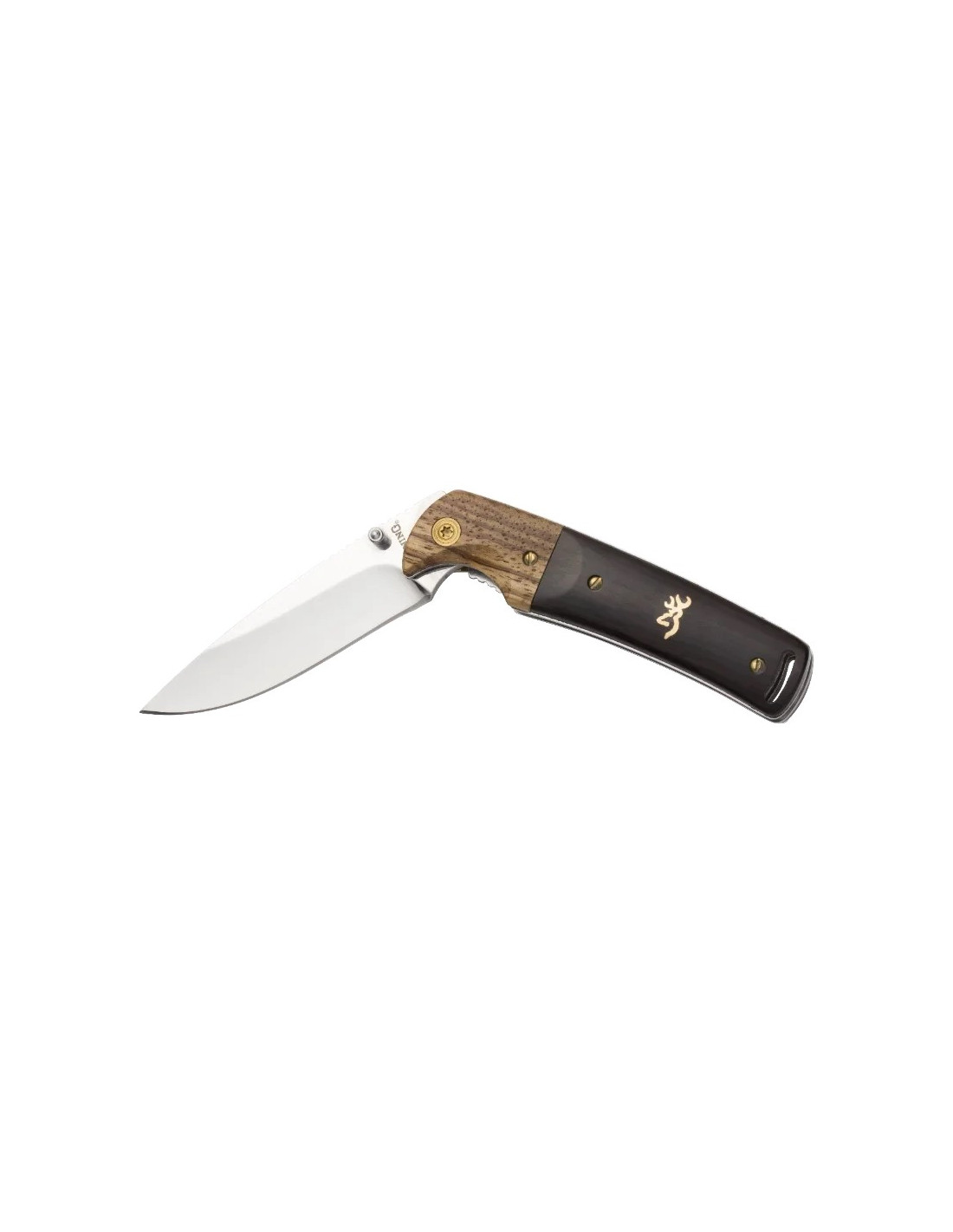 Browning® Buckmark® Hunter är en elegant fällkniv, designad med flytande graciösa linjer, som också är en fullt fungerande och praktisk jaktkniv. Det spegelpolerade droppspetsbladet är tillverkat av 8Cr14MoV rostfritt stål med en ihålig markkant. Bladet öppnas med 1 hand med en av de dubbla tumdubbarna; och bladet låses upp med ett pålitligt foderlås. Tummen som sticker på bladets ryggrad och en uttalad fingerspole förhindrar att handen glider på bladet under användning. Polerade greppskalor av lövträ fästs på stålfoder med mässingsstift och utsmyckas med Buckmark-logotypen. Buckmark Hunter fällkniv levereras med en fickklämma i rostfritt stål, en snoddplats och en läderbältesslida.