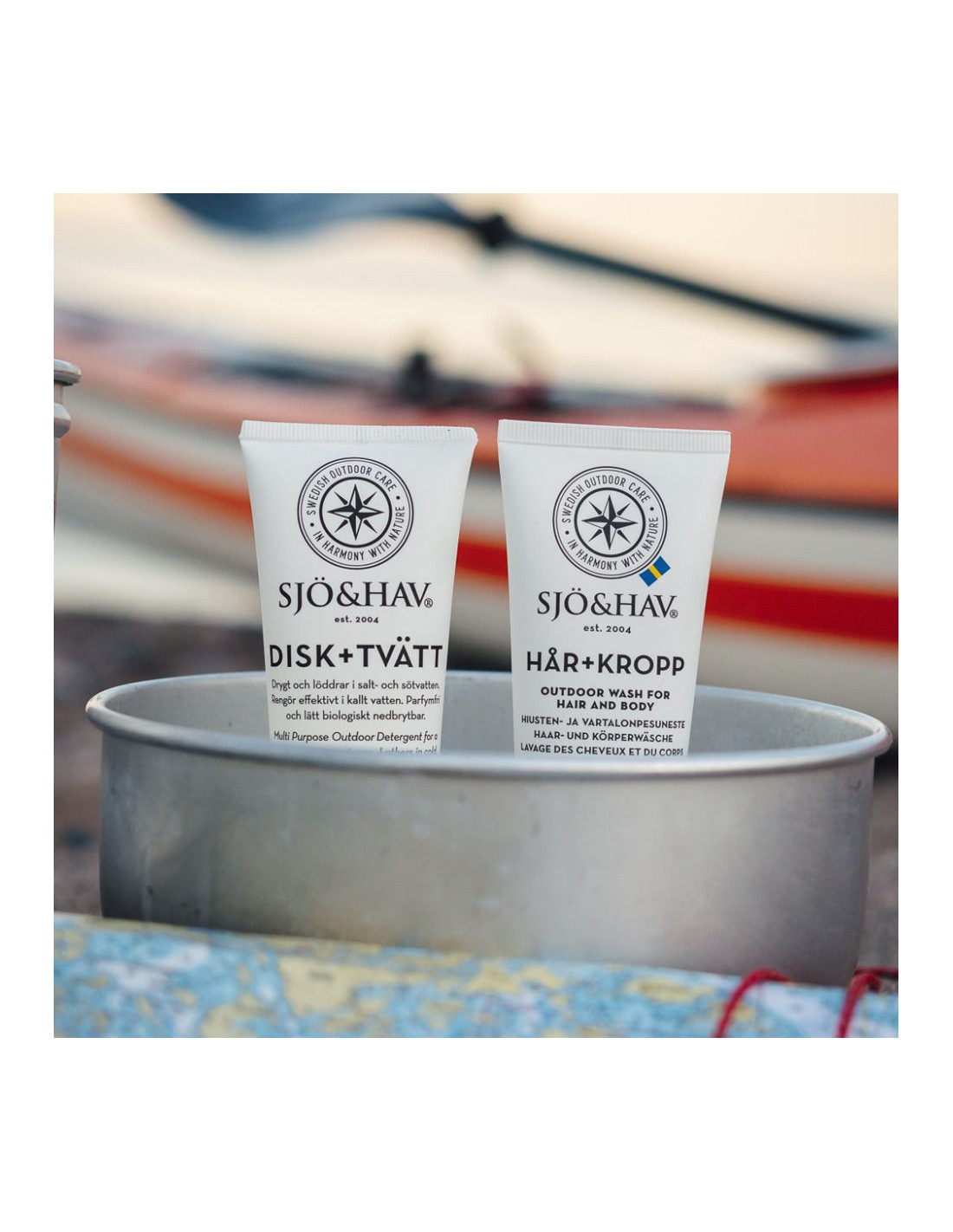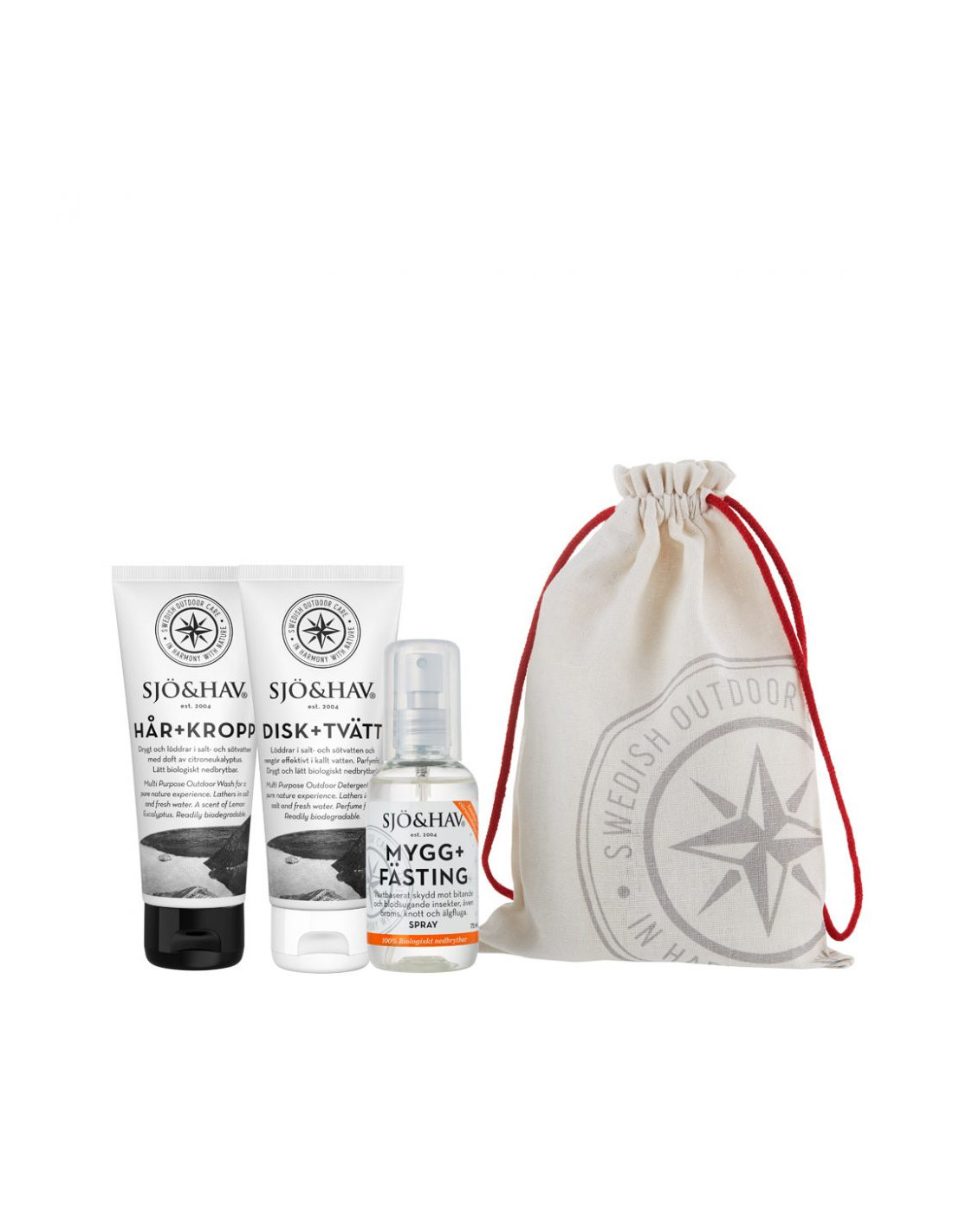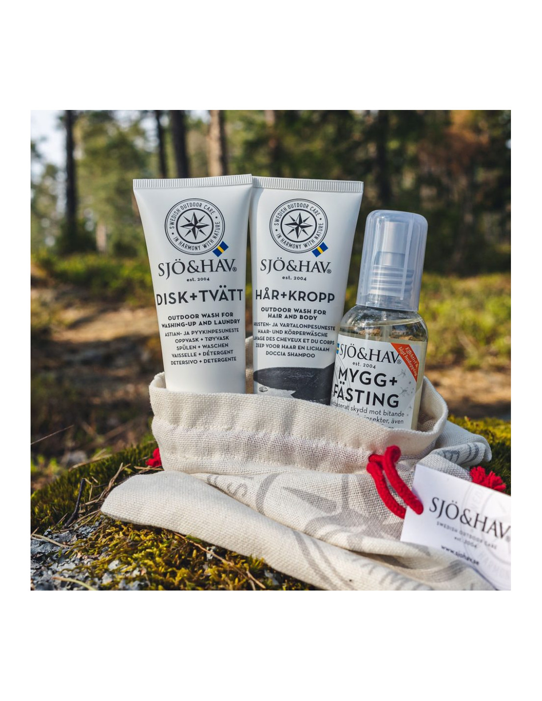 Multirengöring i två varianter, Hår + Kropp och Disk + Tvätt samt ekologisk mygg- och fästingspray i Sjö&Hav-påse av återvunnen bomull.