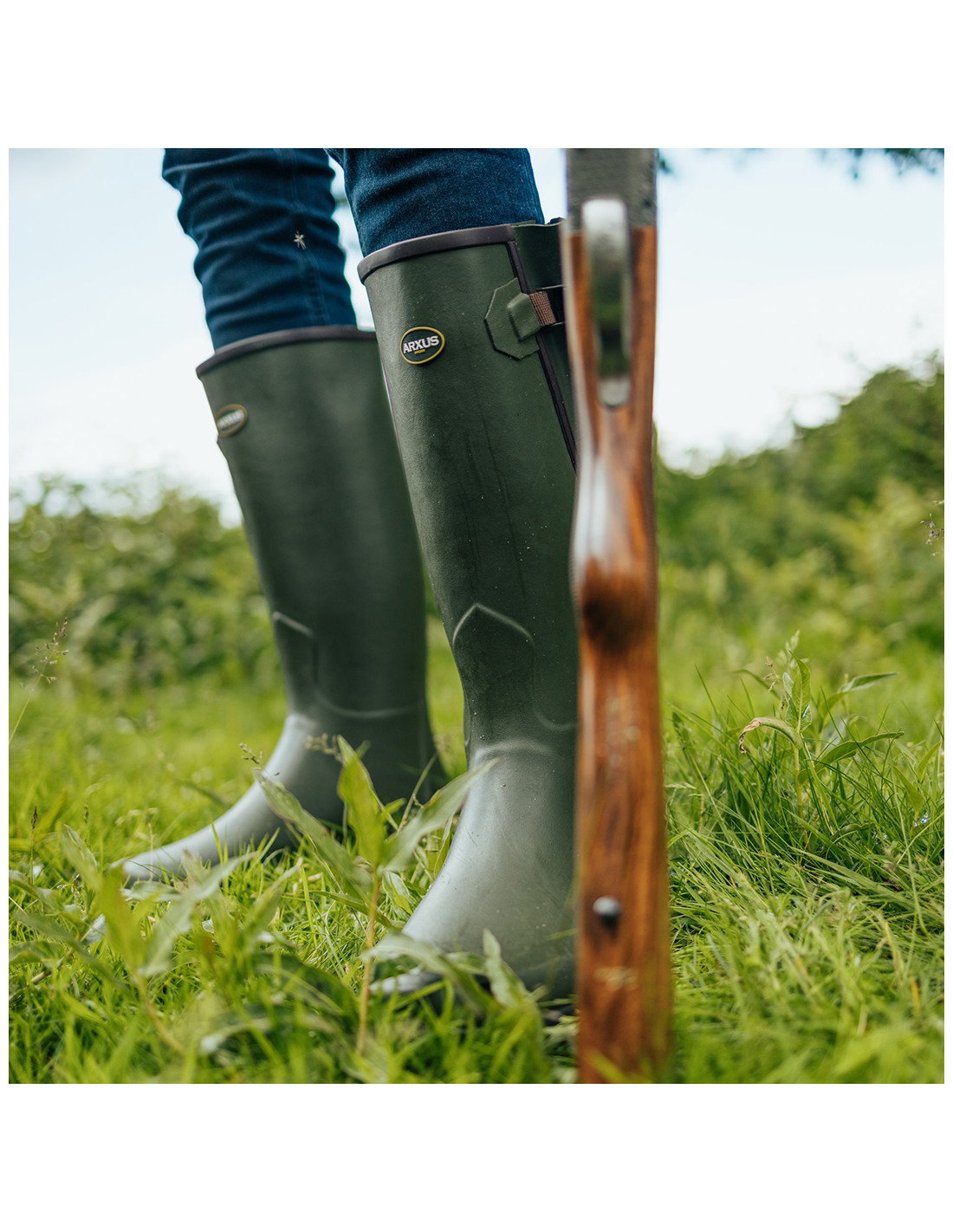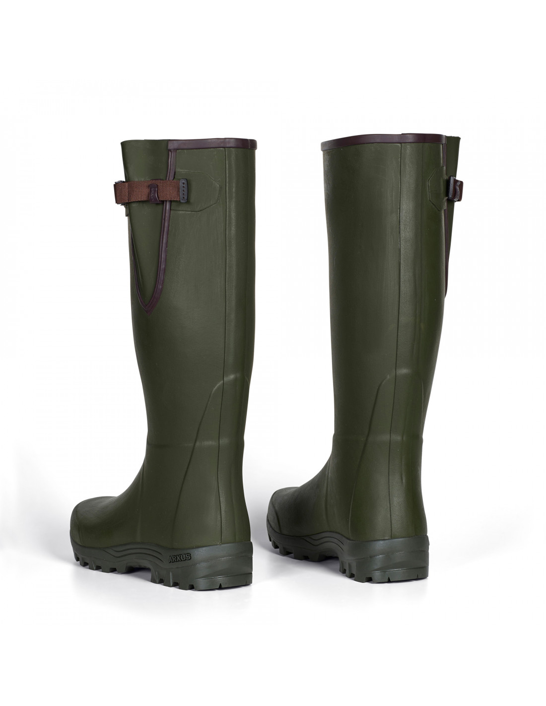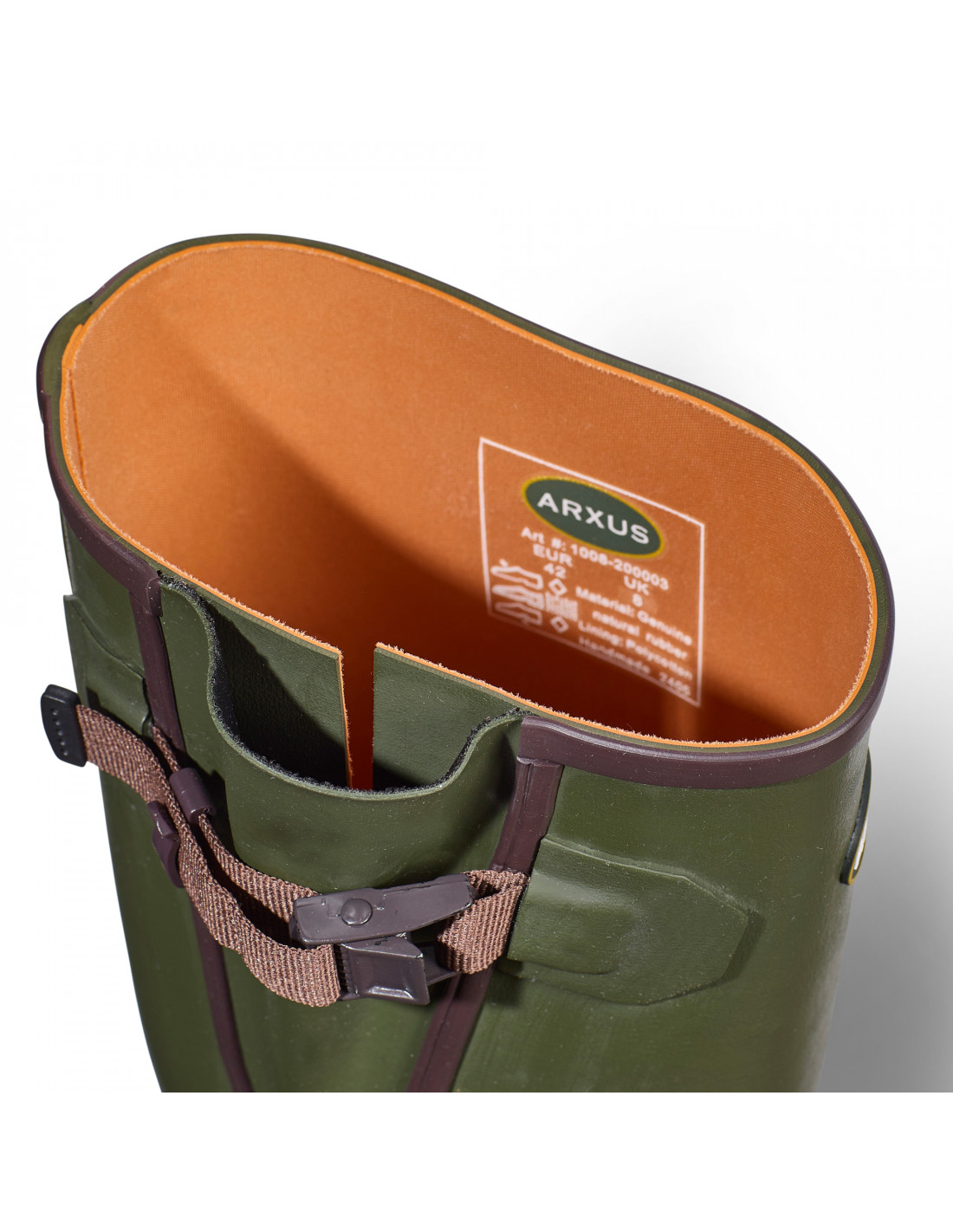 Liksom Arxus alla övriga modeller så används endast 100% rent naturgummi. Det yttre gummilagret är 2 mm tjockt vilket är genomgående för Arxus gummistövlar. Modellen har en infälld reglerbar kil i skaftet som dras åt till önskat vadmått med en justerbar spännrem. Metallspännet håller remmen effektivt på plats. Sulans unika X-mönster ger ett förstklassigt fäste i alla riktningar.